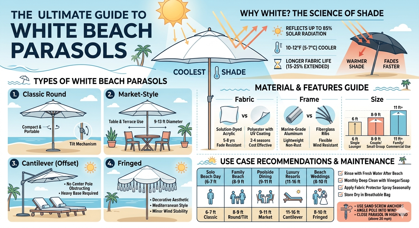Guía de estilos y tamaños de sombrillas de playa blancas por caso de uso